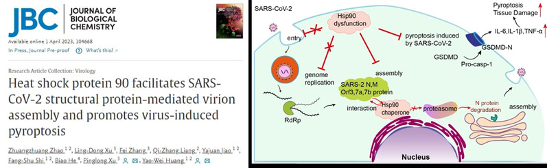 热休克蛋白(HSP90)是一种分子伴侣蛋白,可以帮助其它蛋白质正确折叠并保持其稳定性。已有实验结果表明,在体外条件下使用特定的HSP90抑制剂可以有效抑制新冠病毒(SARS-CoV-2)在细胞培养系统中的感染。然而,其作用机制一直未明。4月1日,黄耀伟教授以华南农业大学兽医学院/岭南现代农业广东省实验室为第一单位,在国际生物化学著名期刊Journal of Biological Chemistry(JBC, IF=5.486)上在线发表题为“Heat shock protein 90 facilitates SARS-CoV-2 structural protein-mediated virion assembly and promotes virus-induced pyroptosis”的文章(链接 https://www.sciencedirect.com/science/article/pii/S0021925823003101),进一步阐述了新冠病毒与HSP90的互作机理。