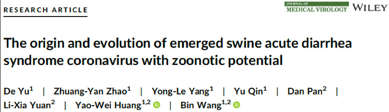此外,课题组近日还在《Journal of Medical Virology》(JMV,IF=20.69)发表题为“The origin and evolution of emerged swine acute diarrhea syndrome coronavirus with zoonotic potential”的文章(Yu et al., J Med Virol. 2023;95:e28672)(论文链接:https://onlinelibrary.wiley.com/doi/10.1002/jmv.28672),通过综合分析系统发育、病毒-宿主共进化、重组、密码子以及病毒S蛋白序列与结构比对,探索和细化SADS-CoV的进化历程。研究结果提供了一个关于SADS-CoV起源与进化的新视角,对未来可能出现的潜在SADS-CoV人畜共患病以及相关的公共卫生健康问题或有所借鉴。