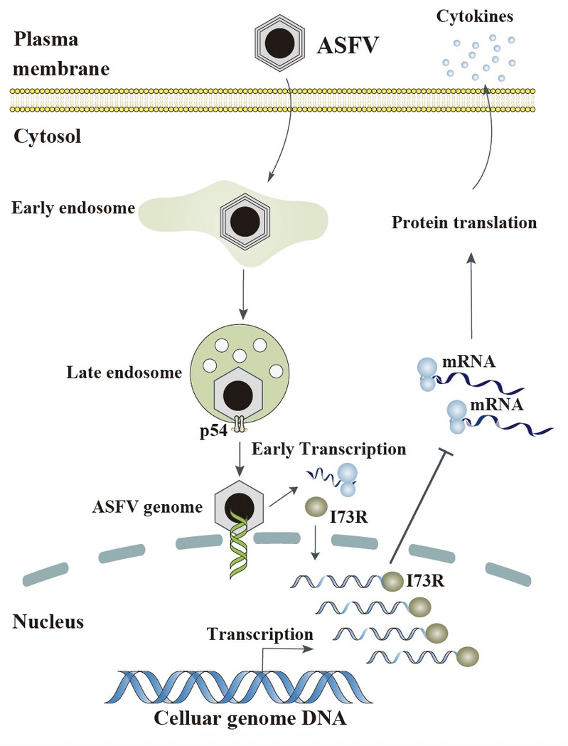ASFV不同毒株间基因组大小不同,在170~193kb之间,可编码150~200种病毒蛋白,其中一半以上的蛋白功能未知,免疫逃逸机制复杂,且致病机理还不清楚。因此,深入研究ASFV编码蛋白的功能,有利于阐明ASFV感染与宿主抗病毒反应相互作用的分子机制。该研究分析了非洲猪瘟病毒感染猪骨髓巨噬细胞后的病毒基因组转录谱,筛选并鉴定了ASFV编码的免疫抑制基因I73R,深入研究了I73R蛋白调控宿主抗病毒蛋白合成的分子机制。研究发现I73R蛋白是一个具有高度亲和力的核酸结合蛋白,在病毒感染早期启动转录表达并定位在细胞核中,发挥核酸结合特性,阻止宿主高GC成分的mRNA出核,从而广泛抑制宿主抗病毒蛋白的合成。体内致病性研究显示,缺失I73R基因的重组病毒完全丧失对家猪的致病性,能够抵抗致死剂量亲本强毒株的攻击,表明I73R蛋白是ASFV编码的主要毒力基因之一。上述研究结果为深入理解非洲猪瘟病毒致病性和免疫逃逸机制提供了新的理论基础,为非洲猪瘟疫苗及抗病毒药物的研发提供了新的思路。