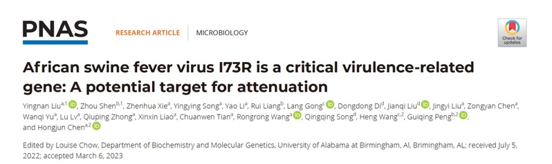 近日,中国农业科学院上海兽医研究所陈鸿军团队、华南农业大学张桂红团队、华中农业大学彭贵青团队联合金宇保灵生物药品有限公司,发现一个非洲猪瘟病毒(ASFV)新型毒力基因,并解析其抑制宿主抗病毒蛋白质合成的分子机制。相关研究成果以“African Swine Fever Virus I73R is A Critical Virulence-related Gene: A Potential Target for Attenuation”为题发表在国际顶级期刊《美国国家科学院院报(PNAS)》(全文链接:https://pubmed.ncbi.nlm.nih.gov/37023125/)
