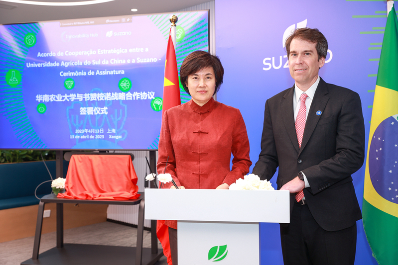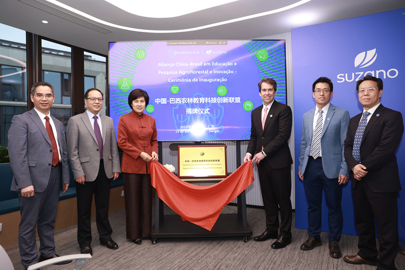 4月12日深夜,巴西总统卢拉率政府代表团抵达上海,开启对中国为期四天的国事访问。作为代表团访华的重要内容之一,13日下午,部分参众两院议员、政府官员和企业代表20余人参访了在沪巴西跨国企业书赞桉诺(上海)材料科技发展有限公司(简称“书赞桉诺”)的研创中心,并见证了我校牵头成立的“中国—巴西农林教育科技创新联盟”(简称“中巴农林科创联盟”)的揭牌。该专业联盟是在“中国—拉丁美洲农业教育科技创新联盟”(中拉联盟)框架下,由中国和巴西主要农林高校、研究机构及企业组成,旨在推动中巴农业科教交流,深化农林产学研及技术转移合作而成立的新机构。在揭牌仪式上,华南农业大学校长刘雅红与书赞桉诺亚洲区新业务总裁Pablo Francisco Gimenze Machado共同为联盟揭牌。同时,两人还签署了华南农业大学与书赞桉诺的战略合作协议,推动双方的合作交流走深走实、实现新的发展。