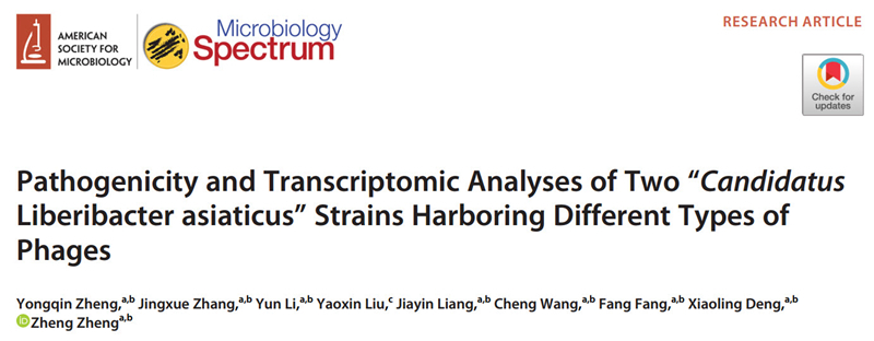 近日,我校植物保护学院柑橘黄龙病研究团队在微生物学Top期刊Microbiology Spectrum(影响因子9.04,中科院一区TOP期刊)发表了题为“Pathogenicity and transcriptomic analyses of two ‘Candidatus Liberibacter asiaticus’strains harboring different types of phages”的研究论文(论文链接:https://journals.asm.org/doi/10.1128/spectrum.00754-23)。该研究首次发现了含有不同类型噬菌体的黄龙病菌株间存在致病力差异的现象,并以长春花为指示寄主,系统解析分析了不同菌株间存在致病力差异的分子机制。