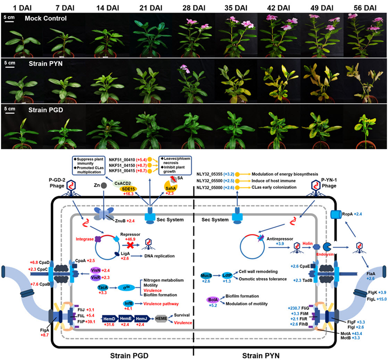 本研究通过选取广东产区(低海拔,命名为菌株PGD,含有Type 2噬菌体)和云南产区(高海拔,命名为菌株PYN,含有Type 1噬菌体)的代表菌株,以长春花为指示寄主,系统比较分析两个菌株在长春花植株上的致病表现。研究发现,菌株PGD比菌株PYN具有更强的复制能力与致病性,即感染PGD菌株的长春花植株更早地出现黄化症状,且表现更为严重的矮化症状。定量分析发现,菌株PGD携带的Type 2噬菌体为单拷贝,而菌株PYN携带的Type 1噬菌体则表现为多拷贝。全基因组分析发现,Type 2噬菌体具有溶原相关的特异基因,而Type 1噬菌体则含有溶菌相关的特异基因。