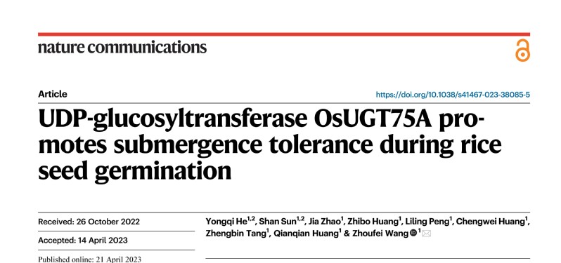 近日,农学院王州飞教授团队在国际知名学术期刊Nature Communications在线发表题为“UDP-glucosyltransferase OsUGT75A promotes submergence tolerance during rice seed germination”研究论文(论文链接:https://www.nature.com/articles/s41467-023-38085-5)。该研究揭示了淹水条件下水稻种子胚芽鞘伸长的调控机制。