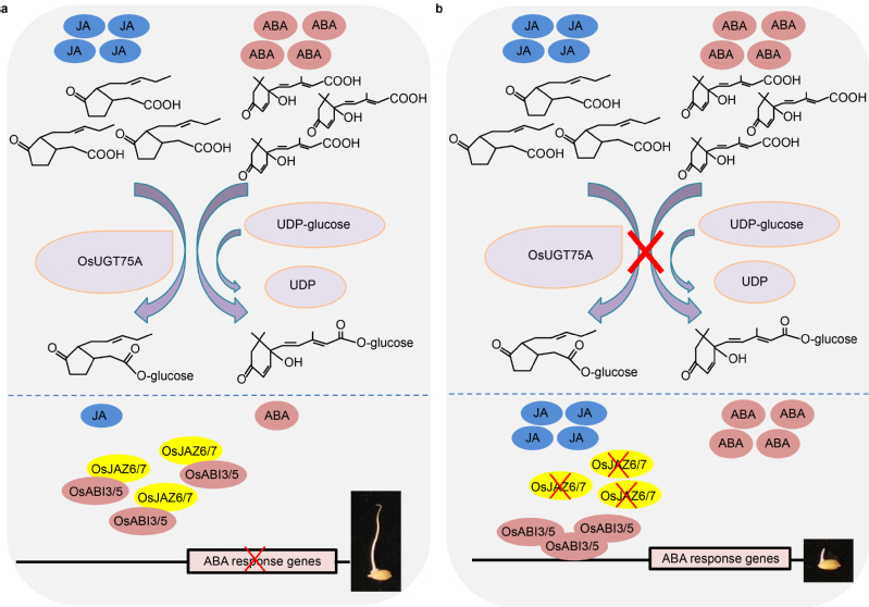 近年来,直播稻轻简栽培得到广泛应用,但与插秧栽培方式相比,草害是直播稻生产中遇到的重要问题之一。生产上常用“以水控草”方式除草,但是长期淹水会导致种子萌发困难、田间成苗率低,严重影响直播稻产量。水稻对淹水胁迫的适应,涉及两种不同的对立机制,即“静止策略”和“逃逸策略”。其中,“逃逸策略”指在淹水条件下,水稻胚芽鞘快速伸长,迅速升至水面,从而将氧气输送到种子中,进行有氧呼吸,对保障直播稻成苗具有重要作用。本研究鉴定到一个控制淹水条件下水稻胚芽鞘快速伸长的关键基因OsUGT75A,该基因通过糖基化ABA和JA,精准调控种子和胚芽鞘中游离态ABA和JA含量,从而通过ABA和JA信号通路介导胚芽鞘伸长;在粳稻中鉴定到了OsUGT75A基因优异单倍型,并验证了该基因在提高水稻耐淹性遗传改良中的应用价值。该研究成果进一步揭示了水稻通过“逃避策略”提高耐淹性的分子机制,为今后培育适宜淹水直播的水稻品种提供线索,为保障直播稻安全生产提供帮助。