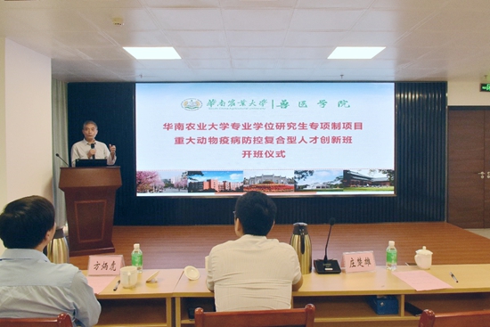 近日,学校重大动物疫病防控复合型人才创新班开班仪式在肇庆大华农生物制品有限公司联合培养基地、岭南实验室肇庆分室西江实验室(下称“西江实验室”)举行。