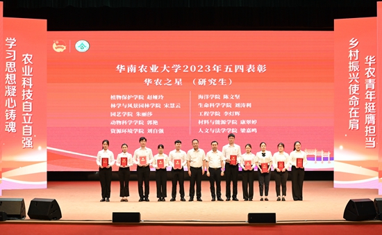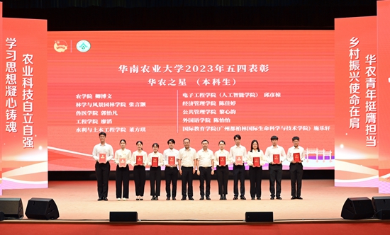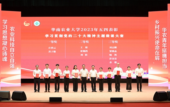 大会表彰了2022-2023年度“五四”红旗团委标兵、学生会标兵、研究生会标兵、团支部标兵,2023年十佳班集体,2022-2023年度优秀共青团干部标兵、优秀共青团员标兵、优秀学生骨干标兵,第九届本科生及研究生“华农之星”以及辅导员学习贯彻党的二十大精神主题微课大赛获奖教师,并为获奖集体与个人颁奖。