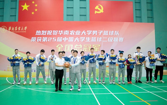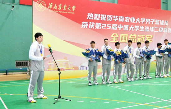 “欢迎第25届中国大学生篮球二级联赛全国总冠军——华南农业大学男子篮球队凯旋!”5月25日晚,学校在田家炳体育馆为载誉归来的华农男篮举行了简单而隆重的欢迎仪式。副校长钟强出席仪式。