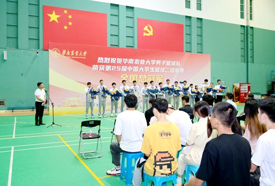 仪式上,同学们为队员们送上鲜花,热烈的掌声和欢呼声将冠军球队环绕。现场宣读了广东省教育厅贺信。贺信中写道,“华农男篮在全国大学生篮球赛场上展现出的高超竞技水平和良好精神风貌,是学校办学水平、育人质量的生动写照,为广东学校体育争得了荣誉,增添了光彩。”
