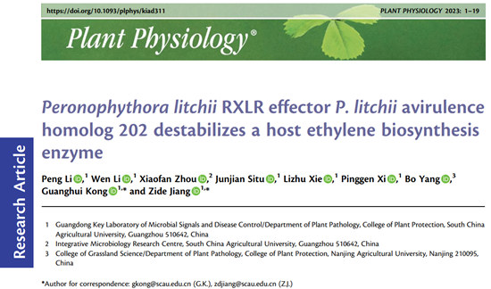 近日,我校植物保护学院荔枝病害研究团队在Plant Physiology发表了题为“Peronophythora litchii RXLR effector P. litchii avirulence homolog 202 destabilizes a host ethylene biosynthesis enzyme”的研究论文,该研究揭示了荔枝霜疫霉RXLR效应分子干扰植物激素乙烯合成,抑制植物免疫的分子机制。