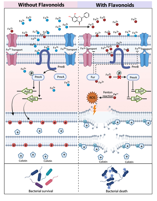 针对上述科学问题,研究团队使用模拟宿主内体环境的培养体系进行黏菌素增效佐剂的筛选。筛选发现7,8-二羟基黄酮,杨梅素和木犀草素可以有效提高黏菌素的杀菌能力,并且包括黏菌素耐药的肠杆菌科细菌。在进一步的协同作用机制研究表明,上述具有邻苯二酚结构的黄酮类化合物可以扰乱细菌胞内的铁稳态,使胞内从高比例的Fe3+转变成高比例的Fe2+状态,从而减弱PmrB对Fe3+的响应,并减少PmrA的磷酸化水平及其下游脂多糖修饰基因的表达水平。最终导致细菌膜上正电荷修饰减少,使更多的黏菌素可以有效地和细菌细胞膜结合,从而增强黏菌素的杀菌效果。该研究结果表明了靶向细菌铁稳态作为开发新的抗菌方案策略的潜力。