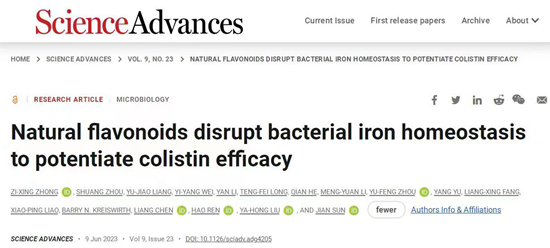 近日,我校兽医学院、国家兽医微生物耐药性风险评估实验室、岭南现代农业科学与技术广东省实验室和广东省兽药研制与安全评价重点实验室刘雅红教授团队在综合性期刊一区Top期刊SCIENCE ADVANCES(IF=14.136)在线发表了题为“Natural flavonoids disrupt bacterial iron homeostasis to potentiate colistin efficacy”(https://doi.org/10.1126/sciadv.adg4205)的研究长文。