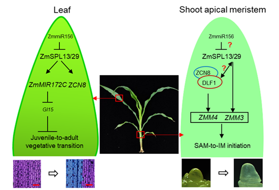 图2:ZmSPL13/29调控玉米营养生长时相转变和成花转变的作用模型