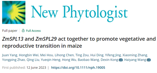 近日,我校生命科学学院、亚热带农业生物资源保护与利用国家重点实验室、岭南现代农业科学与技术广东省实验室王海洋教授课题组在New Phytologist (IF2022 = 10.323)上发表了题为“ZmSPL13 and ZmSPL29 act together to promote vegetative and reproductive transition in maize”的研究论文(链接:https://doi.org/10.1111/nph.19005),解析了玉米ZmSPL13/29参与年龄途径调控玉米开花期的分子机制。