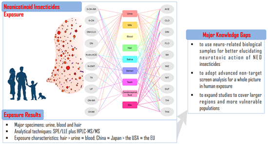 新烟碱是一类传统有机磷类和拟除虫菊酯类杀虫剂的高效替代产品,基于其广谱性、特有神经毒性以及对哺乳动物的“低毒性”而广受欢迎。本文综述了2010至2022年间20种新烟碱杀虫剂及其代谢产物在不同人体样本基质中的化学分析方法和暴露特征,主要包括人体样本固相/液液前处理萃取、高效液相色谱三重四级杆串联质谱分析、目标化合物在不同人体基质、地域人群的暴露水平和特征。此外,本文指出新烟碱杀虫剂人体暴露的研究方向:关注与神经相关的人体样本的收集和分析,解析新烟碱杀虫剂潜在的人体神经毒性;采用非靶标筛查技术全面构建新烟碱人体暴露谱图;扩大调查范围,探索新烟碱广泛使用地区以及对敏感人群的潜在健康效应。