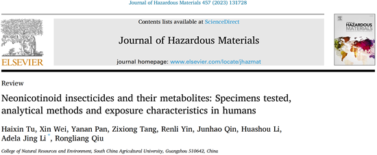 近日,我校资源环境学院2019级生态学本科生涂海欣以第一作者在Journal of Hazardous Materials(影响因子14.224,中科院一区)期刊上,发表了题为“Neonicotinoid insecticides and their metabolites: Specimens tested, analytical methods and exposure characteristics in Humans”的研究论文(链接:https://doi.org/10.1016/j.jhazmat.2023.131728)。