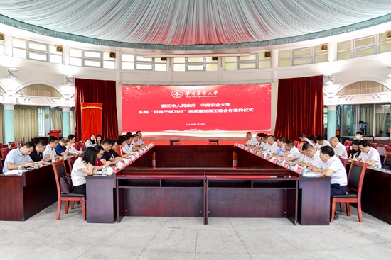为深化校地合作,助推高质量发展,6月19日上午,我校在红满堂举行签约仪式,与肇庆市人民政府签订实施乡村振兴战略合作框架协议,合作共建乡村振兴研究院肇庆分院,并为肇庆分院揭牌;与廉江市人民政府签订实施“百县千镇万村”高质量发展工程合作框架协议和一批科技合作项目协议。
