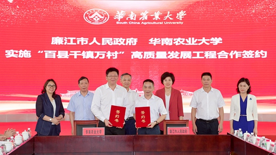 在与廉江的合作方面,乡村振兴研究院廉江分院于2021年揭牌,是粤西地区首个乡村振兴研究分院。学校还与廉江市在湛江鸡产业研究中心、丝苗米产业园等领域开展了多种形式的合作,取得了良好的成效。此次学校与廉江市正式签订“1+4”系列合作协议和项目,是我省“百县千镇万村”高质量发展主题的首个校地合作协议,将在培育壮大廉江县域经济、推动镇村融合发展、建设宜居宜业和美乡村,为廉江市农业现代化建设和乡村全面振兴提供全方位科技人才支撑等方面开展深入合作。
