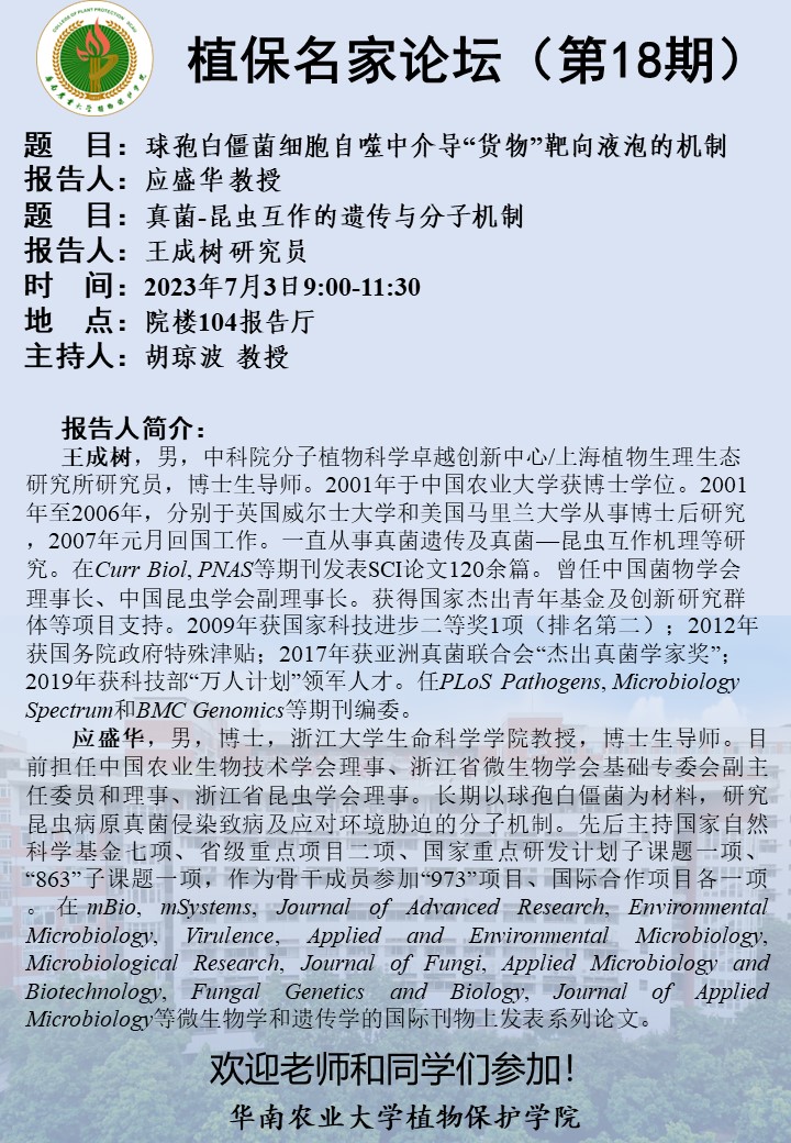 植保名家论坛第18期:球孢白僵菌细胞自噬中介导“货物”靶向液泡的机制、真菌-昆虫互作的遗传与分子机制