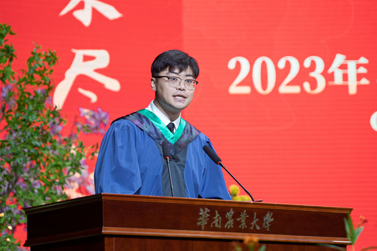 “时间总是催促着我们向人生的下一站出发,带不走的却是我们一生的华农情。我们是一辈子的华农人,要知农爱农、强农兴农,在希望的田野上建功立业!”研究生毕业代表、兽医学院2020级基础兽医学专业硕士研究生鲁兆祥表示,今后将铭记母校恩情、常怀感恩之心,牢记初心使命、全心服务“三农”,努力成为新时代奋勇前进的搏击者,以青春之名,赴时代之约。