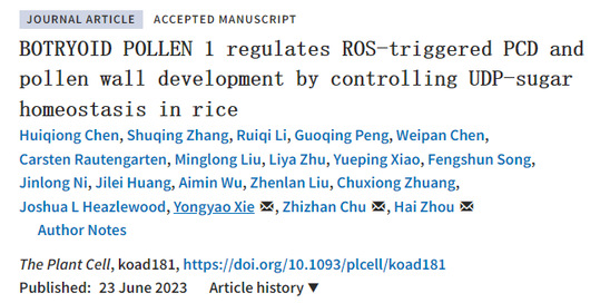 近日,我校生命科学学院、亚热带农业生物资源保护与利用国家重点实验室和岭南现代农业科学与技术广东省实验室周海/初志战/谢勇尧团队在The Plant Cell在线发表了题为“BOTRYOID POLLEN 1 regulates ROS-triggered PCD and pollen wall development by controlling UDP-sugar homeostasis in rice”的论文(论文链接:https://academic.oup.com/plcell/advance-article/doi/10.1093/plcell/koad181/7205863?searchresult=1),揭示了UDP-糖代谢参与水稻花药绒毡层和花粉壁发育的分子机制。