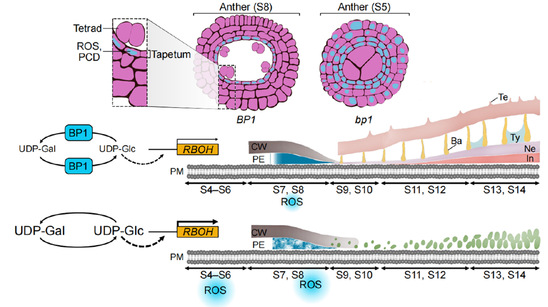 该团队在水稻品种台中65的转化后代中发现了一个完全雄性不育的突变体。表型观察发现其花粉粘连成葡萄簇状,难以分离,因此将其命名为葡萄簇状花粉(botryoid pollen 1,bp1)突变体。遗传分析发现该性状受一对基因控制,图位克隆结合TAIL -PCR结果显示UDP-葡萄糖差向异构酶基因(UGE1)的5'UTR区域存在一个T-DNA插入。BP1/ UGE1具有催化UDP-葡萄糖和UDP-半乳糖相互转化的功能,从而调节UDP-糖的平衡,在水稻花药发育的大部分阶段发挥重要作用。BP1功能的丧失导致了UDP-葡萄糖的大量积累和其他UDP-糖的不平衡。突变体bp1中较高的UDP-葡萄糖及其衍生物含量可能诱导NADPH氧化酶基因的表达,导致活性氧(ROS)的过早积累,从而诱导花药壁程序性细胞死亡(PCD)的提前,但是最终绒毡层降解的结束又是延迟的。UDP-葡萄糖作为代谢物,其积累导致胼胝体降解异常,从而导致小孢子相互黏连。最后,发现UDP-糖的代谢还参与小孢子壁初始框架的形成,由于bp1中UDP-糖的代谢异常导致花粉壁的工字型结构完全瓦解。该研究结果揭示了UDP-糖可能作为信号分子调控细胞ROS积累和PCD,又可作为代谢物质参与胼胝体降解和花粉壁形成的分子机制。