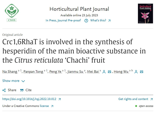 近日,我校生命科学学院药用植物研究中心吴鸿教授团队于Horticultural Plant Journal(农林科学1区Top期刊,IF2023=5.7)在线发表了题为“Crc1,6RhaT is involved in the synthesis of hesperidin of the main bioactive substance in the Citrus reticulata ‘Chachi’ fruit(Crc1,6RhaT调控茶枝柑中的主要活性物质橙皮苷的合成)”的研究论文。该研究将广陈皮原植植物茶枝柑中Crc1,6RhaT的表达模式与分泌囊的发育联系起来,通过多种研究手段,系统深入地探究了茶枝柑果实发育过程中Crc1,6RhaT促进茶枝柑果皮中橙皮苷合成的分子细胞学机制。首次为橙皮苷可能在液泡中合成提供了细胞学证据,为深入研究类黄酮物质合成与积累场所提供了新的视角,对于开展药用植物有效成分的合成和积累的研究以及指导广陈皮高品质药材采收具有重要的理论和实际指导意义。
