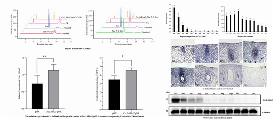 体外酶功能验证结果表明Crc1,6RhaT蛋白可以催化橙皮苷和柚皮芸香苷的合成。Crc1,6RhaT在茶枝柑叶中的瞬时过表达结果显示,当Crc1,6RhaT的表达量上升,橙皮苷的相对含量也有显著提高。原位杂交组织特异性以及Crc1,6RhaT在基因和蛋白表达水平的变化与橙皮苷的相对含量在时空变化规律上的一致性,指出Crc1,6RhaT在调控茶枝柑果实中橙皮苷的合成具有重要作用。