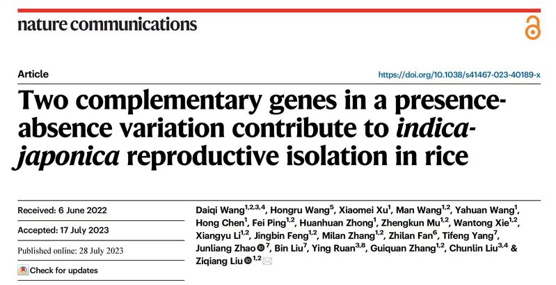 近日,我校农学院刘自强课题组在国际知名学术期刊Nature Communications在线发表题为“Two complementary genes in a presence-absence variation contribute to indica-japonica reproductive isolation in rice”的研究论文(论文链接:https://www.nature.com/articles/s41467-023-40189-x)。该研究报道了一个存在缺失变异(Presence-absence variation, PAV)中所包含的籼粳杂种不育基因座Se促进水稻籼粳亚种间生殖隔离的新机制。