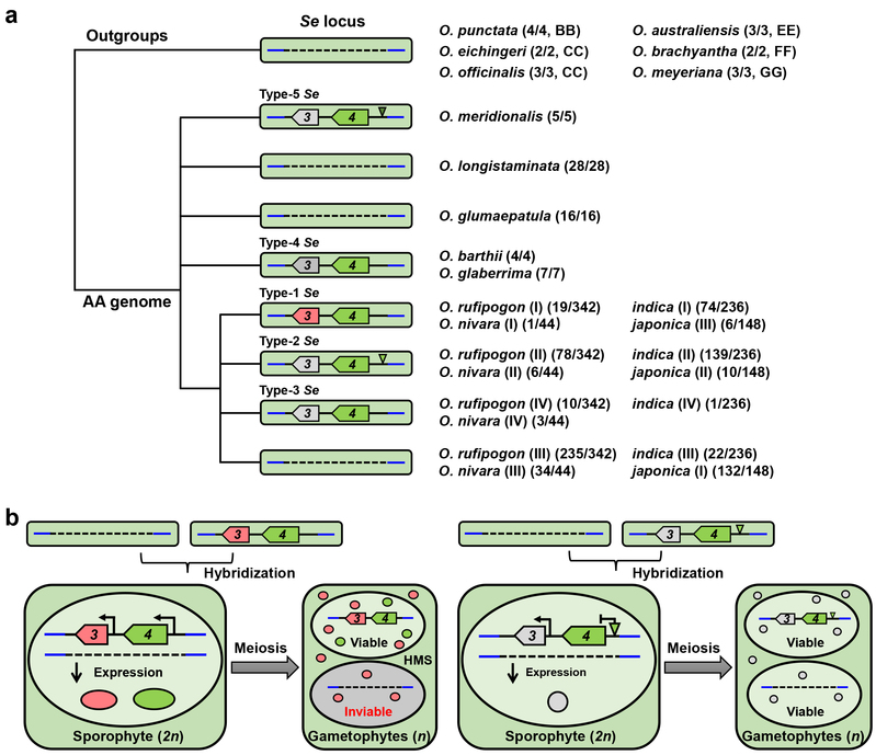 亚洲栽培稻包含籼稻和粳稻两个亚种,二者在形态、生理以及基因水平上存在显著差异,籼粳亚种间的遗传差异会产生强大的杂种优势,具有进一步提高水稻产量的潜力。然而,籼粳亚种间的生殖隔离会导致籼粳亚种间杂种的育性下降,结实率低,严重限制了其强大杂种优势的利用。该研究以粳稻品种T65和以籼稻品种GLA4为供体、T65为受体的近等基因系E9为研究材料,在水稻第12染色体的一个PAV中成功克隆了籼粳杂种不育基因座Se。该基因座包含两个相邻且具有互补效应的基因ORF3和ORF4,ORF3编码一个孢子体花粉杀手,而ORF4以配子体方式保护花粉。在籼粳杂交的F1中,粳型单倍型的花粉由于缺乏ORF4的保护作用,会受籼型单倍型花粉ORF3的毒性作用而发生选择性败育。进化分析结果表明ORF3是一个与亚洲栽培稻种复合体相关的新基因,Se基因座的PAV促进了亚洲栽培稻籼粳亚种之间生殖隔离的形成,同时也支持了籼稻和粳稻是由不同的普通野生稻独立驯化而来的理论。这项工作为水稻亚种间合子后生殖隔离的形成提供了新的视角,并为克服籼粳杂交育种中的生殖障碍奠定了基础。