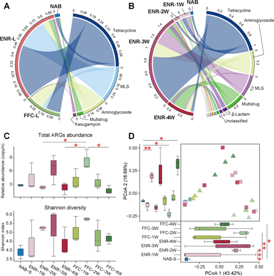 在绿色健康养殖的新形势下,农业农村部一直致力于推进全国兽用抗菌药综合治理工作。这一工作的核心目标就是减少抗菌药物的滥用和过度依赖,以保障动物健康、人类健康和环境可持续发展。然而,长期以来,“开口药”作为一种常用的预防性治疗方案,被广泛应用于雏鸡养殖中,针对预防雏鸡白痢和沙门氏菌等疾病以及促进生长。该课题组的研究发现,短期使用抗生素并不能显著提高雏鸡的生长速度,而长期使用抗生素甚至可能减缓其生长速度。更为严重的是,预防性抗生素的使用干扰了雏鸡肠道微生物菌群的建立和稳定,而肠道菌群的紊乱导致雏鸡对H9N2禽流感病毒的抵抗能力减弱。此外,预防性抗生素的使用导致机会病原体(如志贺氏杆菌)的丰度上升,打破了人们对预防性使用抗生素能控制病原体的普遍认知。同时,不论是长期还是短期使用抗生素都会导致肠道菌群抗生素耐药性基因的数量上升,给公共健康带来严重风险。因此,“开口药”这种预防雏鸡白痢和沙门氏菌等疾病的养殖方式存在较大的危害。种鸡净化鸡白痢和沙门氏菌才是更好的养殖方式,也是推进“减抗”工作的重要思路。