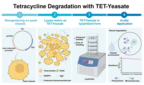 此前,刘雅红团队在2019年首次发现可介导高水平替加环素耐药的四环素类抗生素降解酶Tet(X)(相关成果发表于Nature Microbiology,IF:28.3),Tet(X)的发现对全球耐药性的研究产生重要影响。研究团队后续在Tet(X)的溯源、进化以及应用开展了一系列研究工作,并取得重要研究成果。在应用上,研究团队通过毕赤酵母分泌表达并提取四环素降解酶Tet(X),证明了Tet(X)在消除环境中残留四环素的可行性(相关成果发表于Sci Total Environ,IF:9.8)。随后为提高降解效率,研究团队基于铜基有机金属框架(MOF)构建了负载降解酶Tet(X)的复合催化体系TM,并深入研究了TM中降解酶Tet(X)通过催化TCs单加氧反应灭活TCs的同时产生双氧水进一步激活MOF通过类芬顿反应产生活性氧增加TCs的降解效率的协同机制(相关成果发表于Chem. Eng. J.,IF:15.1)。尽管如此,上述降解方案中NADPH的添加依然极大程度的限制了Tet(X)的应用。经过不断的优化升级,研究团队发现可通过酵母高丰度的内源性NADPH和高密度增殖的特性解决生产成本问题,从而可进行大规模生产应用。该团队最新研究结果表明,通过毕赤酵母胞内表达Tet(X)建立的TET-Yeasate体系不仅具有更高的TCs降解率,还极大程度降低Tet(X)应用的成本。TET-Yeasate体系由产Tet(X)酶的工程酵母的全细胞裂解产物组成,含有TCs降解成分(Tet(X)、NADPH、Mg2+)和保护性大分子。经优化后的TET-Yeasate能够有效消除自来水、湖水、养殖污水和制药废水等多种临床环境样本中的TCs。研究团队进一步将TET-Yeasate开发成冻干制剂,有效提高了TET-Yeasate的存储稳定性和抗逆性。最后通过耐药基因监测、自然转化及斑马鱼胚胎孵化等实验证实TET-Yeasate不具遗传风险且通过其降解产生的产物无急性毒性。