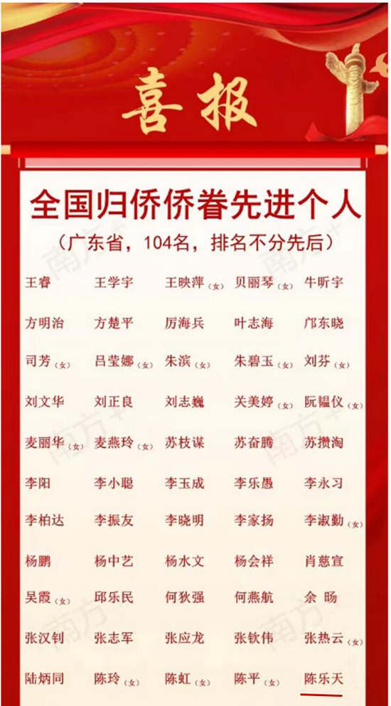8月31日上午,第十一次全国归侨侨眷代表大会在北京人民大会堂开幕。我校侨联主席、广东省政协委员、广东省归国华侨联合会委员陈乐天教授荣获“全国归侨侨眷先进个人”荣誉称号。
