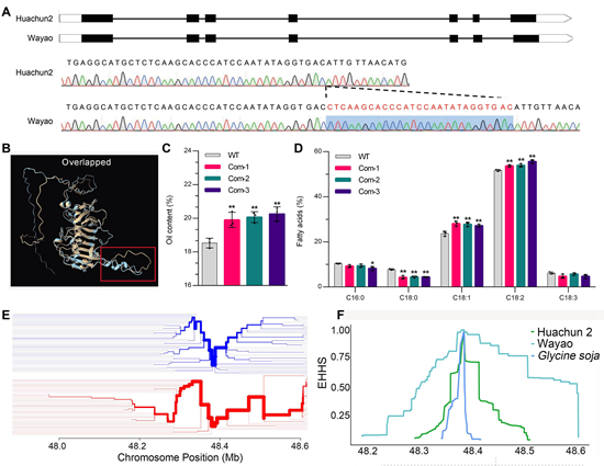 该研究成功克隆了课题组前期在大豆第8号染色体定位的油分QTL(qOil-8-1)主效基因GmFATA1B。GmFATA1B编码酰基-ACP硫酯酶(Acyl-ACP thioesterase)蛋白,参与大豆油分合成和脂肪酸代谢。低油单倍型GmFATA1BWY在第6个外显子上产生9个氨基酸的插入,导致编码蛋白产生结构变异,影响到了其功能。研究人员利用遗传转化材料证实了GmFATA1B是qOil-8-1位点的主效基因,并发现27 bp的插入是导致亲本瓦窑黄豆(Wayao)油分含量低的主要原因之一,同时还发现GmFATA1B具有增加不饱和脂肪酸和籽粒大小的能力。进一步分析GmFATA1B的自然变异发现仅有17份材料为GmFATA1BWY单倍型,且大多数都来源于我国南方地区。通过分析大豆重测序资源,研究人员发现GmFATA1B处于净化选择模式下,GmFATA1BWY单倍型频率维持在极低的水平下。综上,本研究克隆了大豆油分和脂肪酸生物合成途径的重要基因GmFATA1B,为提高大豆油分含量和改变脂肪酸组成提供了潜在的靶点。