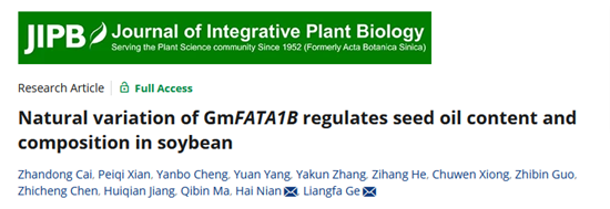 近日,我校林学与风景园林学院葛良法教授和农学院年海教授合作在国际著名杂志JIPB (Journal of Integrative Plant Biology)发表题为“Natural variation of GmFATA1B regulates seed oil content and composition in soybean”的高水平研究论文(DOI: 10.1111/jipb.13561)。