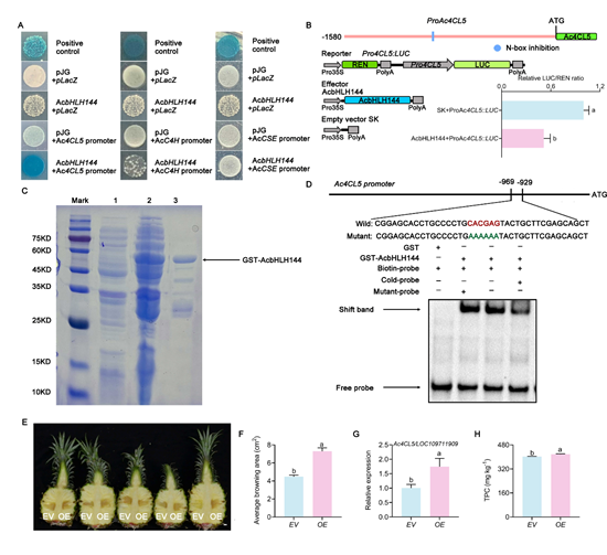 本研究发现,在菠萝贮藏期间,苯丙烷类生物合成途径被激活,这可能是菠萝黑心病发生的内因。通过转录组分析,筛选出一个差异最显著的转录因子AcbHLH144,其在黑心病的果实中表达量显著低于健康果实。该基因在菠萝中瞬时过表达显著抑制菠萝组织褐变、总酚含量和酚类合成基因表达,在拟南芥中异源超表达,显著抑制拟南芥总酚含量和酚类合成基因表达,表明AcbHLH144是菠萝果实贮藏期间酚类物质合成的抑制子。进一步实验证实AcbHLH144通过识别Ac4CL5启动子上的N-box位点,抑制其转录。在菠萝中瞬时过表达Ac4CL5显著促进菠萝组织褐变。