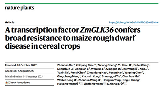 9月14日,我校生命科学学院、亚热带农业生物资源保护与利用国家重点实验室、岭南现代农业科学与技术广东省实验室王海洋教授团队联合中国农业科学院作物科学研究所在Nature Plants(影响因子17.352)在线发表了题目为“A transcription factor ZmGLK36 confers broad resistance to maize rough dwarf disease in cereal crops”的研究论文(论文链接:https://www.nature.com/articles/s41477-023-01514-w),文章揭示了ZmDBF2-ZmGLK36- ZmJMT/ZmLOX8分子模块调控玉米抗粗缩病的遗传基础,为作物抗病改良提供了基因资源。
