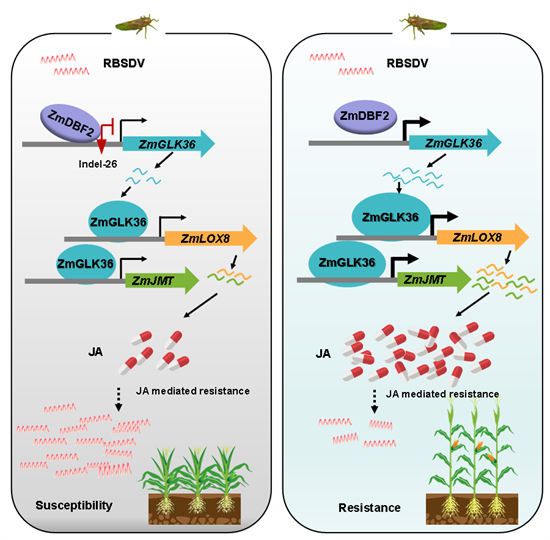 ZmDBF2-ZmGLK36-ZmJMT/ZmLOX8调控玉米粗缩病抗性的分子模型