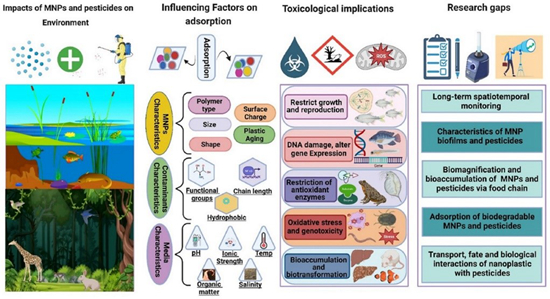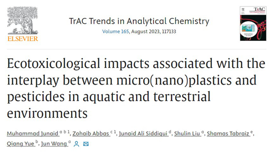 团队在国际著名期刊Trends in Analytical Chemistry发表了题目为“Ecotoxicological impacts associated with the interplay between micro(nano)plastics and pesticides in aquatic and terrestrial environments”的研究论文(论文链接:https://doi.org/10.1016/j.trac.2023.117133)。论文揭示了微/纳米塑料与农药等持久性有机污染物密切相互作用,总结了农药在MNPs的吸附及影响该吸附过程的因素,发现MNPs和农药在水生和陆生生物体内会发生生物积累,并可能引起多方面的影响,包括生长和繁殖障碍、氧化应激、基因和酶反应的改变、代谢异常、多代效应、组织病理学改变、神经毒性和肝毒性等。该研究揭示了微塑料与农药复合污染的相互作用及其生态影响。论文第一作者为博士后Muhammad Junaid,王俊教授为通讯作者。