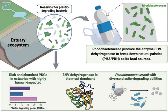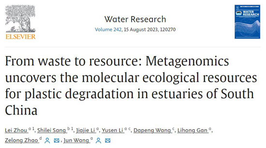 团队在环境科学与生态学领域著名杂志Water Research上发表了题为“From waste to resource: Metagenomics uncovers the molecular ecological resources for plastic degradation in estuaries of South China”的研究论文(论文链接:https://doi.org/10.1016/j.watres.2023.120270)。团队成员基于宏基因组测序,绘制了中国30个亚热带河口的塑料降解基因(PDGs)分布图,发现了珠江口地区的高浓度微塑料污染和最丰富、最多样化的塑料降解基因。珠江口地区主要的塑料降解细菌属于红细菌科,其降解天然塑料的中心基因是3HV脱氢酶。该研究提出了一种罗多杆菌科对聚羟基丁酸进行生物降解的潜在途径,为开发塑料废物处理技术提供了潜在的分子生态资源。论文第一作者为海洋学院周磊副教授,王俊教授为通讯作者。