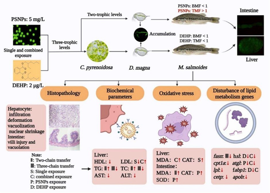 团队在环境科学与生态学领域国际著名杂志Journal of Hazardous Materials上发表了题为“Trophic transfer of nanoplastics and di(2-ethylhexyl) phthalate in a freshwater food chain (Chlorella Pyrenoidosa-Daphnia magna-Micropterus salmoides) induced disturbance of lipid metabolism in fish”的研究论文(论文链接:https://doi.org/10.1016/j.jhazmat.2023.132294),揭示了纳米塑料和二(2-乙基己基)邻苯二甲酸酯会在食物链(小球藻-大型水蚤-鲈鱼)中转移和富集。引发了鱼类的氧化应激和和组织损伤,并干扰了鲈鱼的脂质代谢。这项研究深入揭示了污染物通过食物链转移及其对较高营养水平生物体的负面影响。论文第一作者为博士生研究生廖洪平,王俊教授为通讯作者。