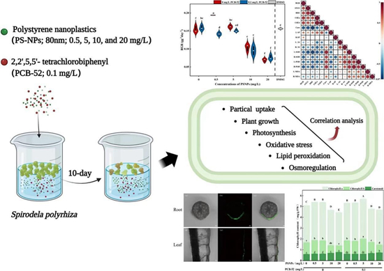 团队在环境科学领域著名期刊Science of the Total Environment发表了题目为“Single and combined toxicity of polystyrene nanoplastics and PCB-52 to the aquatic duckweed Spirodela polyrhiza”的研究论文(论文链接:https://doi.org/10.1016/j.scitotenv.2023.166482)。论文揭示了聚苯乙烯纳米塑料和多氯联苯-52对水生植物浮萍的单一和联合毒性,发现了纳米塑料能进入浮萍根部,聚集在根表面和叶片的下表皮;同时,PCB-52能促进纳米塑料在浮萍中的积累。微塑料单独和与PCB-52联合暴露降低了叶绿素a和b的合成,诱导了氧化应激反应,损伤了浮萍的抗氧化防御系统,并降低了可溶性蛋白质和可溶性糖含量。该研究为评估纳米塑料和多氯联苯对水生植物的生态毒理效应提供了数据支持。论文第一作者为硕士研究生生潘婷,王俊教授为通讯作者。