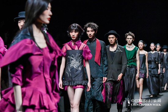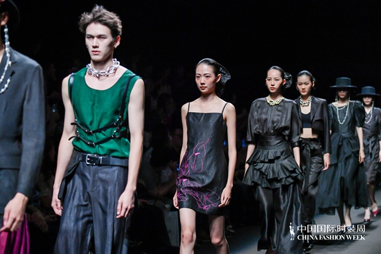 “在路上”寻求当代审美和传统美学之间的平衡,通过色彩融合、款式解构、国风印花以及现代化的配饰建立起中国传统的香云纱文化与当代美学之间的连接,用更年轻的设计语汇承接了传统工艺的质朴,以融入的勇气为香云纱打破了沉闷、单一、飘逸的标签化刻板印象,用叠搭、拼接、不对称的廓形元素活跃了古典文化韵调的基础。从设计创意到最终成品的呈现,都展示了一场属于中国美学的视觉盛宴,通过香云纱的活化,促进中国传统香云纱文化的传承和发展。