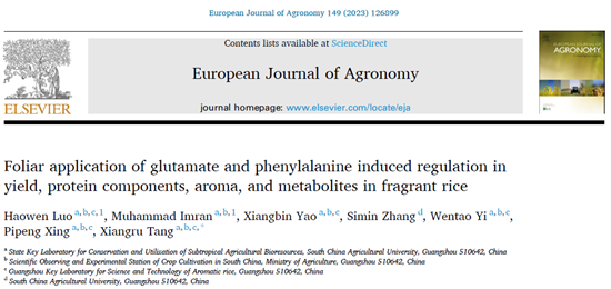 团队在期刊European Journal of Agronomy发表了题为“Foliar application of glutamate and phenylalanine induced regulation in yield, protein components, aroma, and metabolites in fragrant rice”的研究论文(论文链接:https://doi.org/10.1016/j.eja.2023.126899),揭示了抽穗期喷施谷氨酸和苯丙氨酸溶液对香稻蛋白组分、香气挥发物含量以及籽粒和叶片中多种代谢通路和小分子代谢物水平的影响。文章第一作者为博士研究生罗昊文,通讯作者为唐湘如教授。该研究得到国家自然科学基金(31971843和32150410377)、广东省乡村振兴战略专项(2021KJ382)、广东省现代农业产业技术体系(2020KJ105)和广州市科技项目(202103000075)的资助。