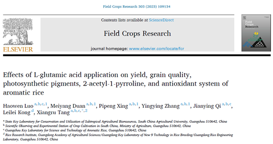 团队在期刊Field Crops Research发表了题为“Effects of L-glutamic acid application on yield, grain quality, photosynthetic pigments, 2-acetyl-1-pyrroline, and antioxidant system of aromatic rice”的研究论文(论文链接:https://doi.org/10.1016/j.fcr.2023.109134),揭示了抽穗期喷施不同浓度的L型谷氨酸溶液对香稻产量形成、稻米品质、光合色素、抗氧化酶活性以及2-乙酰基-1-吡咯啉含量的影响。文章第一作者为博士研究生罗昊文,通讯作者为唐湘如教授。该研究得到国家自然科学基金(31971843)、广东省现代农业产业技术体系(2020KJ105)和广州市科技项目(202103000075)的资助。