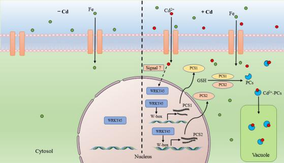 已有的研究揭示,拟南芥WRKY45(AtWRKY45)通过促进高亲和磷转运子 Pht1;1的转录来促进根系吸收磷,AtWRKY45促进叶片衰老,但对AtWRKY45在耐受镉胁迫方面的作用不清楚。王金祥研究小组发现,拟南芥WRKY45赋予拟南芥镉耐受性。镉胁迫下WRKY45基因的表达和蛋白水平增加。与此一致,Cd胁迫增加根和叶中WRKY45的启动子活性。WRKY45的过表达导致PC含量的增加和对Cd耐受性的增强,而WRKY45功能的丧失导致PC含量的降低,从而导致对Cd敏感性的增强。此外,Dual-LUC分析证实WRKY45直接激活编码PC合酶的PCS1和PCS2的表达。EMSA分析证实WRKY45与PCS2启动子区的W-box顺式元件结合。PCS1或PCS2在WRKY45突变体中的过表达可以恢复wrky45对Cd胁迫的耐受性,表明PCS1和PCS2在WRKY45的下游发挥作用。综上,研究小组提供了生理学、生物化学和遗传学证据来证明拟南芥WRKY45通过激活PCS1和PCS2的表达来赋予拟南芥Cd耐受性。