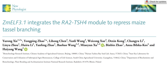 10月19日,我校生命科学学院、亚热带农业生物资源保护与利用国家重点实验室和岭南现代农业科学与技术广东省实验室王海洋教授团队联合中国农业科学院生物技术研究所在国际知名期刊《New Phytologist》在线发表了题目为“ZmELF3.1 integrates the RA2-TSH4 module to repress maize tassel branching”的研究论文(论文链接:https://nph.onlinelibrary.wiley.com/doi/10.1111/nph.19329),文章揭示了光周期响应因子ZmELF3.1调控玉米雄穗分枝数目的分子机制,为玉米雄穗分枝数的遗传改良提供了潜在的基因资源。