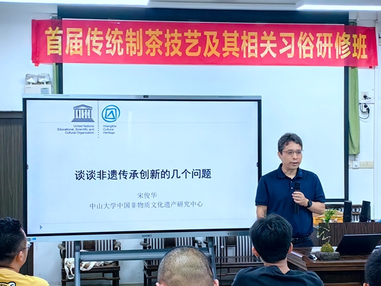 茶艺传承人翁惠璇女士代表学员讲话。中山大学中国非物质文化遗产研究中心主任宋俊华教授以“谈谈非遗传承创新的几个问题”为题,为学员们讲授了精彩的第一课。