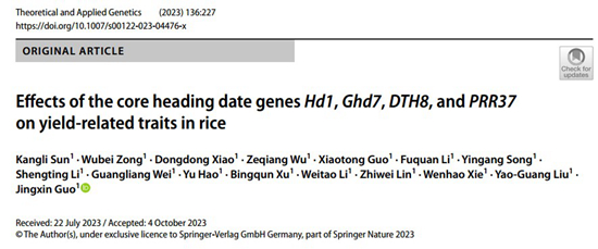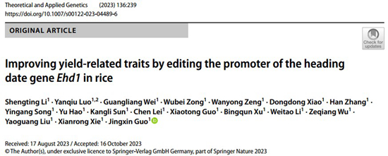 近日,华南农业大学生命科学学院、亚热带农业生物资源保护与利用国家重点实验室刘耀光院士团队,郭晶心和谢先荣研究小组,在国际知名学术期刊Theoretical and Applied Genetics(IF2022=5.3999,农林科学1区 TOP)在线发表两篇题为Effects of the core heading date genes Hd1, Ghd7, DTH8, and PRR37 on yield-related traits in rice以及Improving yield-related traits by editing the promoter of the heading date gene Ehd1 in rice的研究论文(论文链接:https://doi.org/10.1007/s00122-023-04476-x;https://doi.org/10.1007/s00122-023-04489-6)。论文证明了Hd1、Ghd7、DTH8、OsPRR37、Ehd1影响水稻产量性状,为编辑抽穗期基因提高水稻产量提供了有价值的新发现。