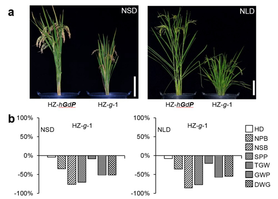 论文一通过基因敲除研究了Hd1、Ghd7、DTH8和PRR37不同单倍型对产量的作用。发现籼梗稻中Ghd7和PRR37均通过上调穗粒数来提高产量,Ghd7-DTH8或Ghd7-PRR37组合对产量的促进作用更强,Hd1负调控产量性状。还鉴定到一种新的弱功能型Ghd7,其内含子3’剪切位点突变导致剪切异常。博士生孙康莉和博士后宗伍辈为共同第一作者。